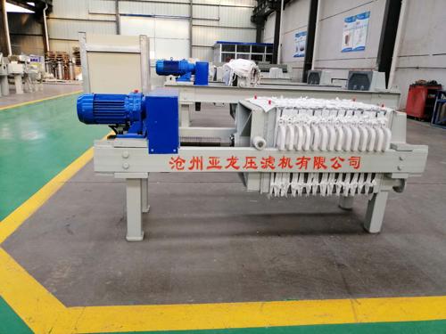 2、機械壓緊:壓緊機構由電動機(配置過載保護器)減速器、齒輪付、絲桿和固定螺母組成。壓緊時,電動機正轉,帶動減速器、齒輪付,使絲桿在固定絲母中轉動,推動壓緊板將濾板、濾框壓緊。當壓緊力越來越大時,電機負載電流大,當大到保護器設定的電流值時,達到壓緊力,電機切斷電源,停止轉動,由于絲桿和固定絲母有可靠的自鎖螺旋角,能可靠地 保工作過程中的壓緊狀態(tài),退回時,電機反轉,當壓緊板上的壓塊,觸壓到行程開關時退回停止。