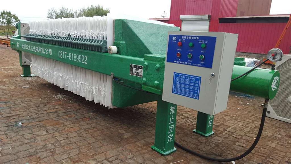 板框壓濾機(jī)由交替排列的濾板和濾框構(gòu)成一組濾室。濾板的表面有溝槽,其凸出部位用以支撐濾布。濾框和濾板的邊角上有通孔,組裝后構(gòu)成完整的通道,能通入懸浮液、洗滌水和引出濾液。板、框兩側(cè)各有把手支托在橫梁上,由壓緊裝置壓緊板、框。板、框之間的濾布起密封墊片的作用。由供料泵將懸浮液壓入濾室,在濾布 上形成濾渣,直至充滿(mǎn)濾室。濾液穿過(guò)濾布并沿濾板溝槽流至板框邊角通道,集中排出。過(guò)濾完畢,可通入清洗滌水洗滌濾渣。洗滌后,有時(shí)還通入壓縮空氣,除去剩余的洗滌液。隨后打開(kāi)壓濾機(jī)卸除濾渣,清洗濾布,重新壓緊板、框,開(kāi)始下一輪工作循環(huán)。